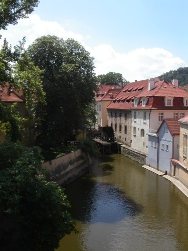 Kampan barokkitaloja, ja vesimylly. Pieni saari Malá Stranan edustalla.